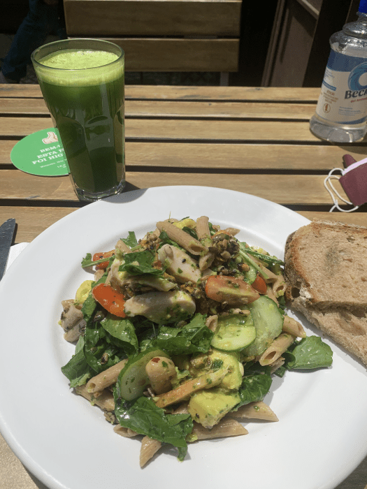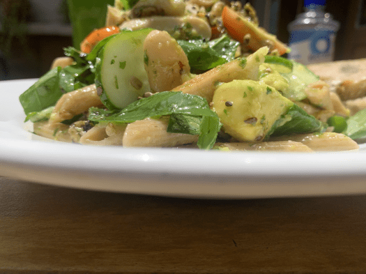 De opção principal, optei pela “salada energética”, com penne integral, tomate, nozes, abacate, frango e rúcula (35,00), que veio bem temperada e saborosa, com a massa “al dente”.