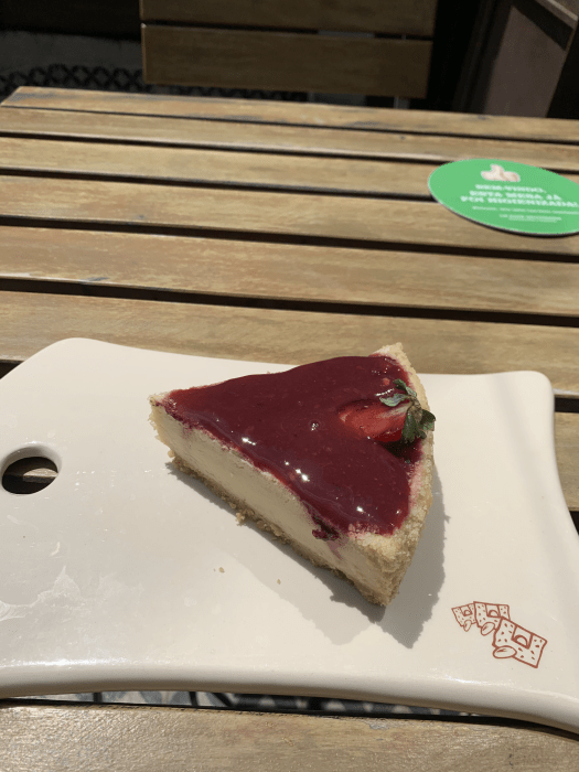 Na sobremesa, quebrei o script, pedindo um cheesecake com calda de morango, que estava cremoso e a calda pedaçuda.