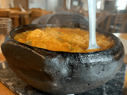 O prato principal foi apostado na galinhada, o prato chefe da casa. Saborosa, o arroz temperado e caldo suculento, com pedaços de carne de galinha que desmancham na boca.