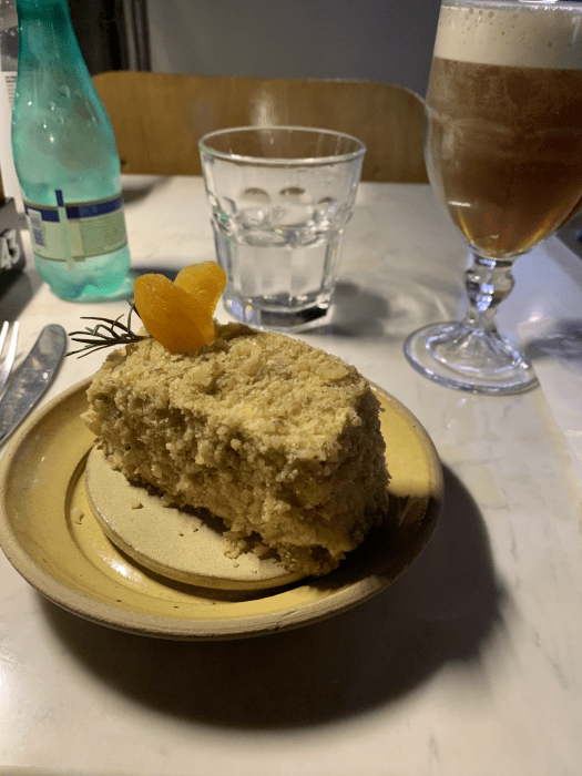 Para comer, optei por um doce que foi a torta de nozes com creme de damasco (14,50), que estava divina, dando para sentir o sabor das nozes e do damasco.