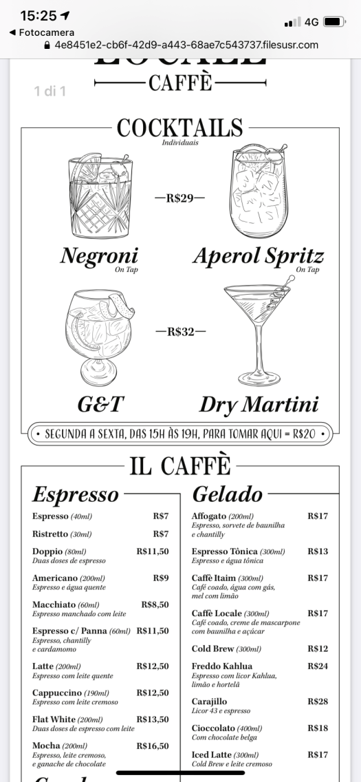 O cardápio, como não poderia ser diferente, é acessado via QR Code. Tem se opções de drinks e cafés, além de doces, como o cannoli, e alguns pratos salgados.