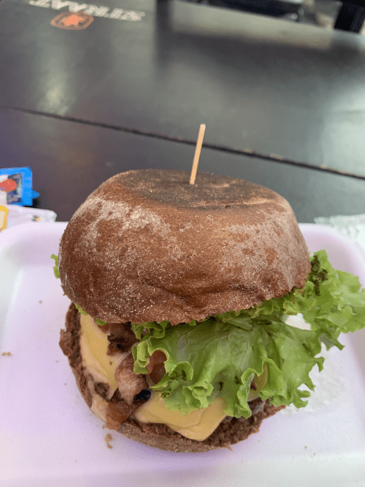 Acabei por ir em um dos que estavam abertos, que servia hambúrguer, onde pedi um cheeseburger no pão australiano (25,00), que estava bom, mas que despedaçou ao pegar na mão, pois estava muito grande.