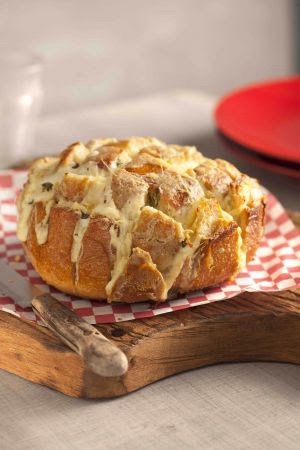 1.Corte o pão italiano em vários cubos, sem separá-lo da base (fica como uma tartaruga).