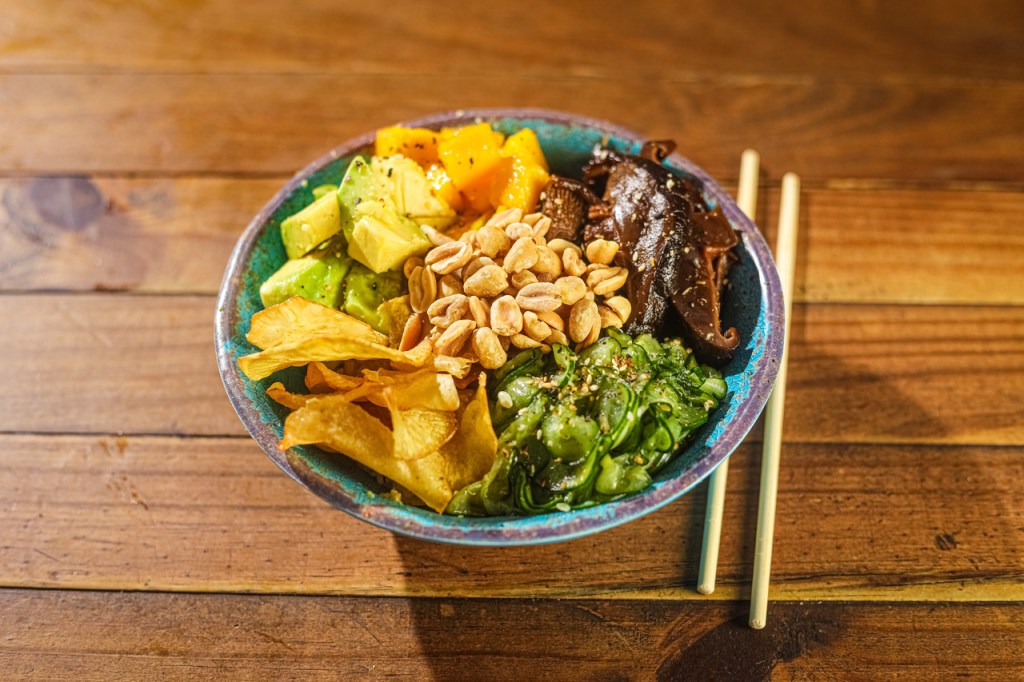 O Poke Vegan (R$34,90) combina cogumelos shitake flambados, manga, abacate, chips de batata-doce, gergelim e sunomono de pepino.