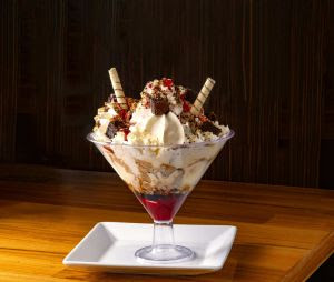 Taça de 1 litro, servida com sorvetes de chocolate, morango ou creme, a sobremesa de R$ 75,90 conta ainda com brownie de chocolate chantilly, granulado de amendoim e cereja.