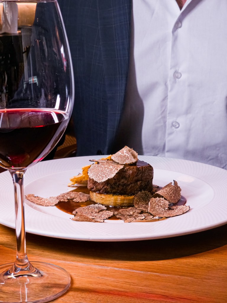 Filé Mignon à Rossini com foie gras, creme de trufas negras e batata gratinada