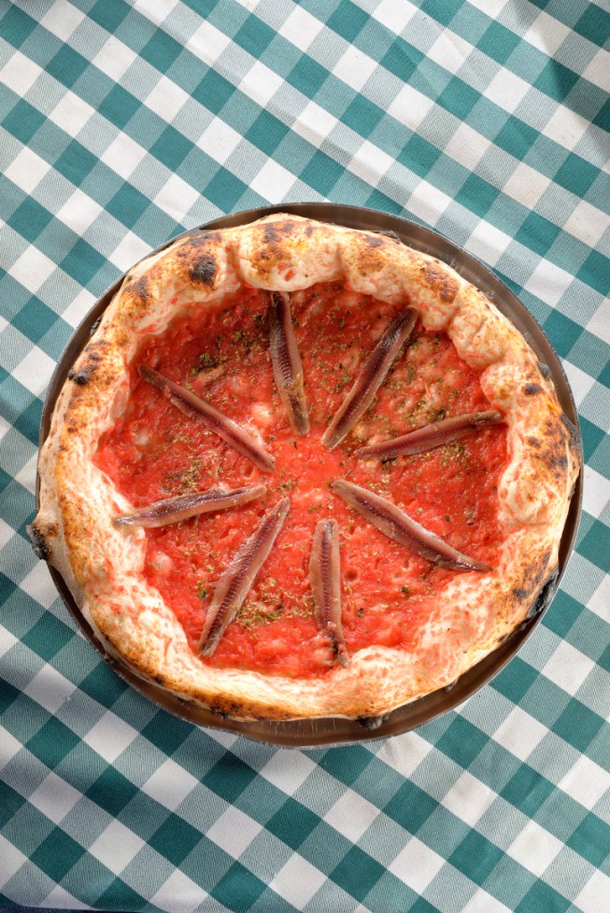 Esta pizza é pura simplicidade, leva apenas o tradicional molho de tomate fresco da casa, com tomates cuidadosamente selecionados e extremamente maduros, o que dá um toque de doçura e baixa acidez, e filés de alici importados de dois lugares: ou do Mar Cantábrico, ou de pesca na costa Amalfitana, em Cetara na Itália, considerados os melhores alicis que existem no mundo.