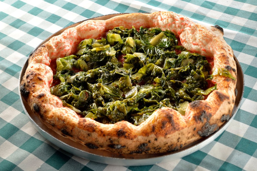 Assim, a cobertura leva a escarola levemente refogada, que mantém seu frescor e amargor sutil, com um leve toque de orégano para finalizar, o que contribui para o equilíbrio ideal entre rusticidade e sofisticação.