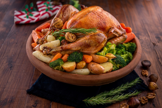 Comece temperando o peru, misturando a manteiga, o alho, o sal, pimenta e ervas. Passe bem a mistura por baixo da pele e por fora do peru. Esfregue o suco de limão e regue com o vinho branco. Deixe marinando por pelo menos duas horas (ou de um dia para o outro na geladeira). Em uma assadeira, coloque a cebola, a cenoura e o salsão no fundo da assadeira e acomode o peru por cima e cubra com papel alumínio. Leve ao forno pré-aquecido por 200°C por cerca de 2h30. Retire o papel, regue com o caldo da assadeira e asse por mais 30-40 minutos para dourar. Fatie o peito e sirva com os acompanhamentos e o molho formado na assadeira.