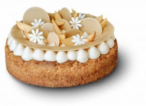 Torta de chocolate branco com milho tostado e pêssego, com doce de leite