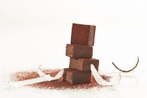 Aqueça o creme de leite, o leite de coco, o açúcar invertido e o pó de caramelo. Adicione essa mistura ao chocolate (que você já derreteu previamente) e misture bem para criar uma emulsão. Despeje a mistura em uma forma de 40 x 40 x 1 cm e deixe descansar por 24 horas. Corte em pedaços e polvilhe com cacau em pó 22-24%.