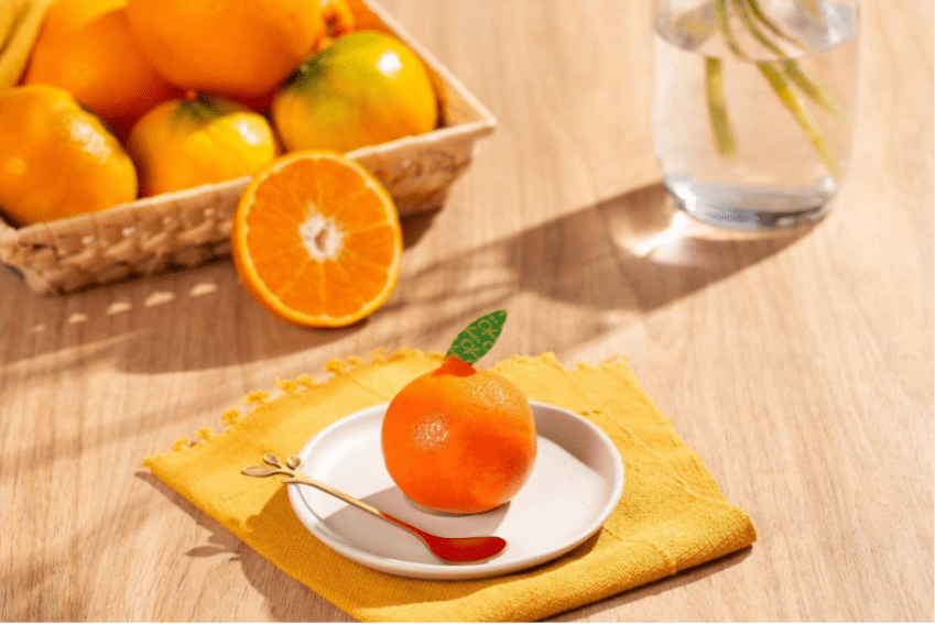 – Bergamota (Entremet de Laranja & Tangerina): Doce em formato de bergamota, com gelée de laranja e tangerina e mousse de laranja, coberto com chocolate branco sabor laranja e finalizado com decoração de chocolate verde em forma de folha.