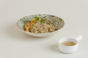 Para o molho, em uma panela, refogue o alho e a cebola no Azeite Nova Oliva, até ficarem bem dourados. Depois, acrescente o leite de coco e deixe em fogo alto até ferver. Abaixe o fogo e deixe até reduzir e engrossar. Acrescente 1 xícara (chá) de creme de tofu ou de castanha, mais ½ xícara (chá) de água.