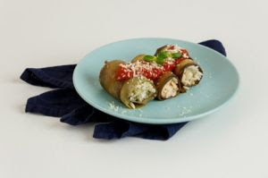 Prepare o conteúdo do pacote de Tio João Cozinha Fácil Arroz com Brócolis conforme as instruções da embalagem e reserve. Corte a berinjela em tiras bem finas. Em uma frigideira coloque um fio de Azeite Nova Oliva, deixe aquecer bem e grelhe as fatias de berinjela. Reserve. Coloque as tiras de berinjela sobre uma tábua de carne, recheie com uma colher do arroz a ponta de cada berinjela e faça rolinhos.