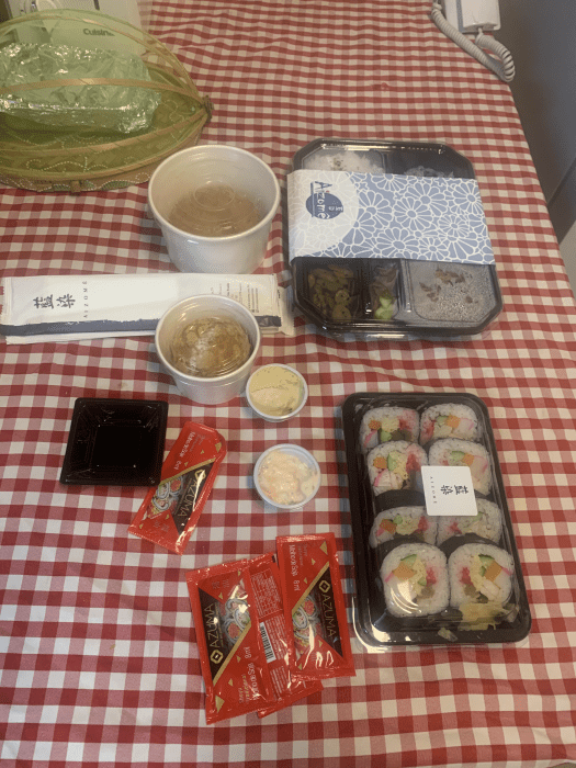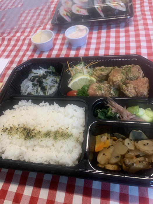 Os pratos que pedi foram o futomaki, sushi de tamanho grande e recheio de Kani, um Bentô Karaage de frango, acompanhado de arroz e macarrão de arroz em uma bandeja, igual são servidos no Japão, alem de um empanado de karê, um peixe típico japonês em formato de bolinho frito, com o nome de Karê Pan.