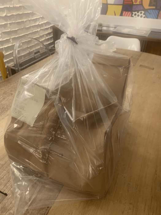 A embalagem vem em um plástico com duas sacolas, dependendo do pedido.