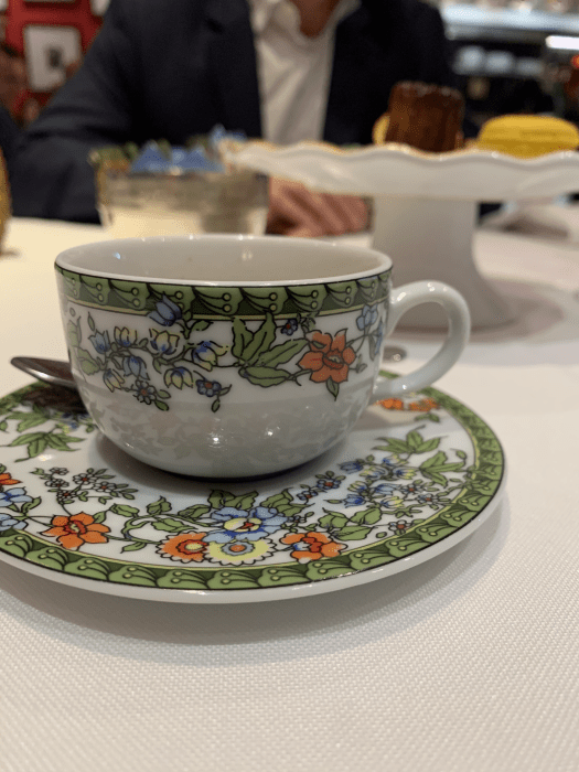 Para finalizar, pedi um café expresso, servido numa xícara de porcelana com detalhes de flores, acompanhado de bolinhos.