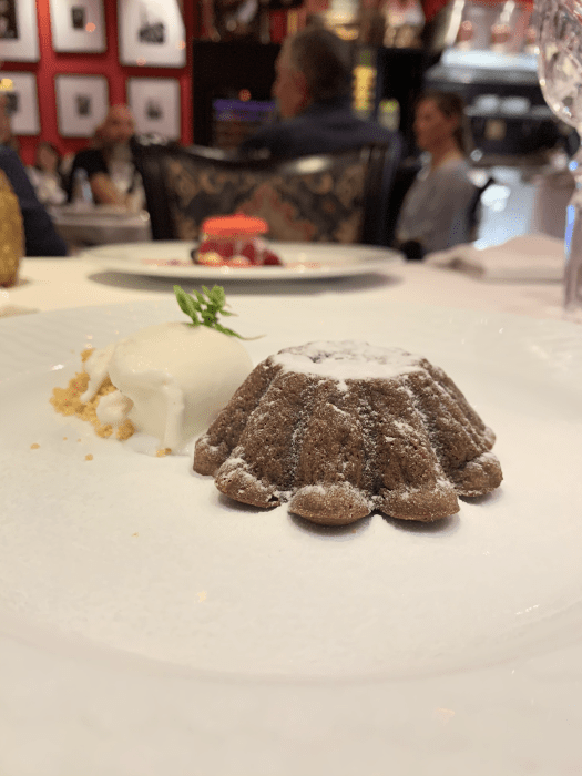 Bolinho úmido e cremoso, em um bom constraste com o gelado do sorvete.