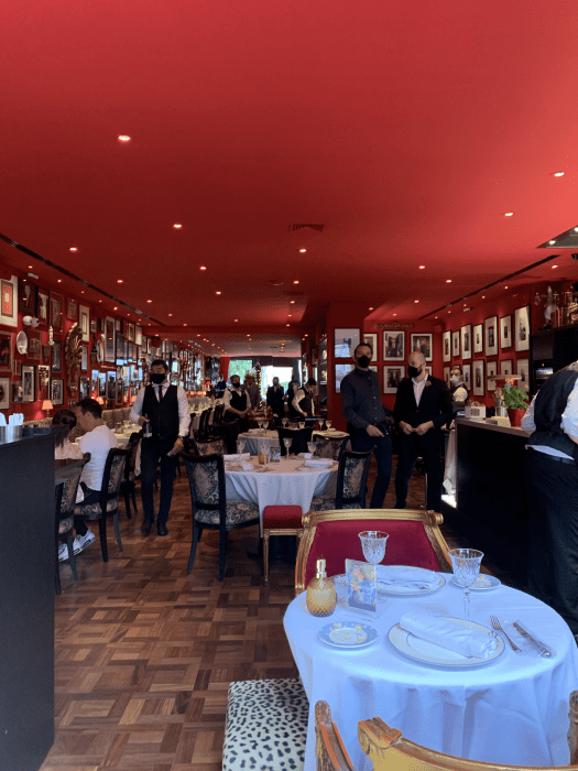 Desde a louça nas mesas até o salão com papel de parede vermelho e um espelho ao fundo, da uma sensação nítida que estamos na capital francesa.