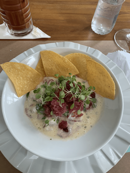 Como entrada optei pelo ceviche com leite de tigre, acompanhado de tortilhas (45,00), que estava saboroso e fresco.