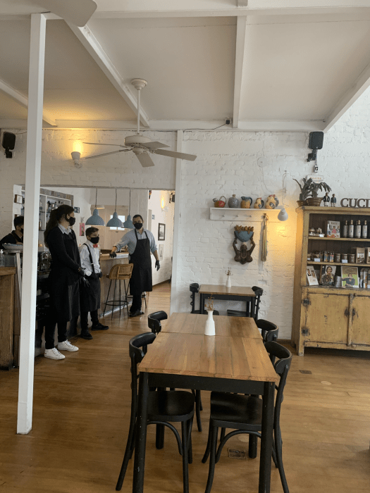 Pequeno mas aconchegante e com decorações de artesanatos nordestino, o salão tinha as mesas com um distanciamento razoável.