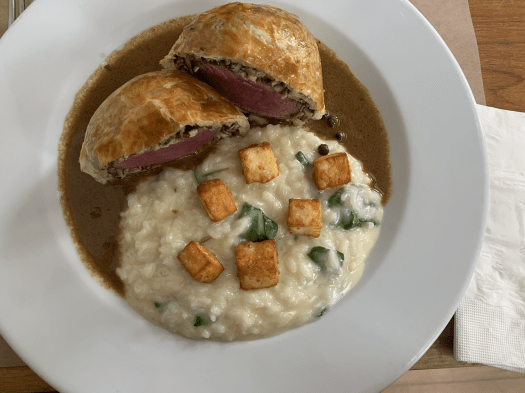De prato principal, pedi um dos pratos mais conhecidos da casa que é o Bife Welington, acompanhado de um risoto de queijo coalho com rúcula (85,00) que estava no ponto certo, apesar da carne se separar da massa na hora de cortar e o arroz cremoso e suculento.